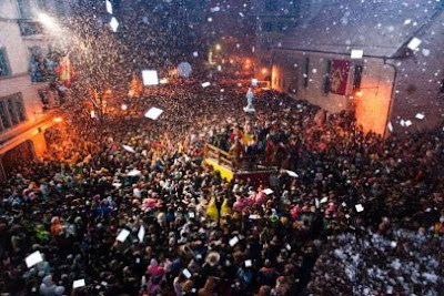 Of course those traditional masks and city "carnival mascots" gather there (after their arrival and walk towards that square), and then wait till thousands of confetti falls on them. They also throw out oranges...and yell stuff etc. Quite funny. Quite intriguing too, and well...messy and hot and crowded.